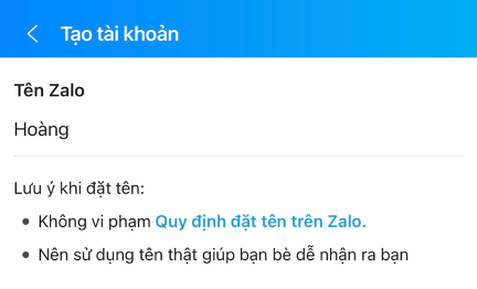 Lưu ý: Tên Zalo cần tuân thủ theo các quy định đặt tên trên Zalo và nên sử dụng tên thật để bạn bè dễ dàng nhận ra bạn.