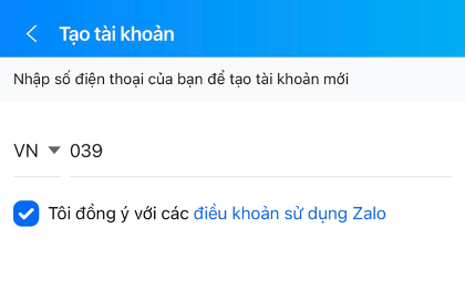 Bước 4: Nhập Số điện thoại của bạn, sau đó bạn cần đọc và tích vào xác nhận Đồng ý với các Điều khoản sử dụng của Zalo. Chọn Tiếp tục.